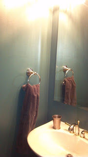 Now, it is much more fabulous. Wallpaper is off, walls are “fixed” and paint is on. And it is a lovely deep shade of teal green with a hint of dark gray. And it’s perfect for that little tiny half bath.